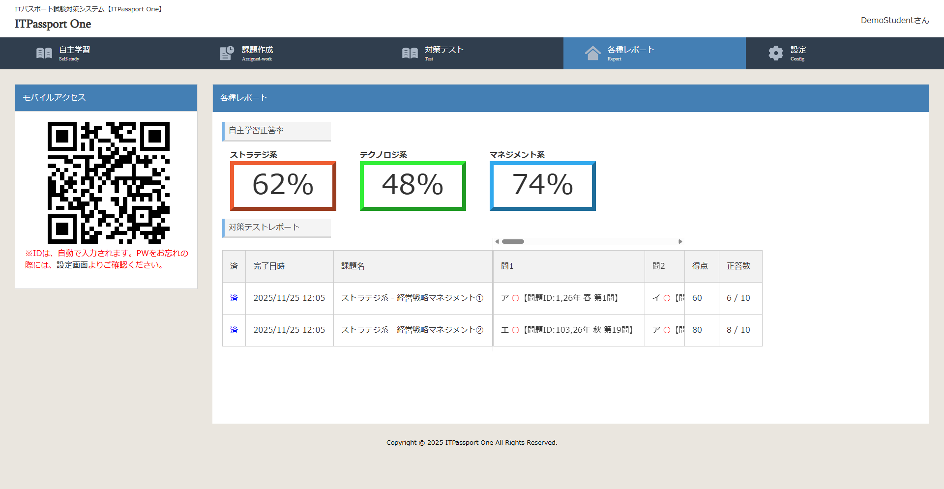自主学習・課題作成・対策テストを通じて理解度を高め、学習ログをもとに分野別の正答率を可視化します。